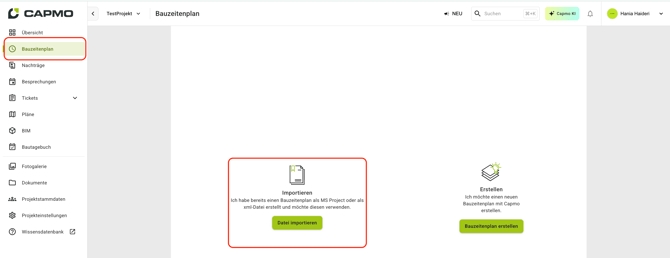 Sie können mit Capmo einen neuen Bauzeitenplan anlegen oder einen bereits erstellten Bauzeitenplan in Capmo importieren.